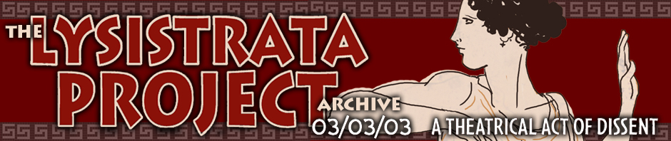 The first was the lead up to the Iraqi invasion under George W Bush. Everyone was aware it was coming and the progressive community was looking for a response. An actress in, I believe, New York, came up with the idea of as many theater companies world wide as possible all doing a reading or production of Lysistrata on the same day (3/3/03) as an antiwar statement. This was picked up in Birmingham by Ellise Mayor and the Birmingham Peace Project. Ellise asked me to be the narrator and provide continuity and Tommy played one of the denied soldiers, complete with balloon phallus. Diane McNaron was also part of the production. It was the first time Ellise, Diane and I worked together and was one of the seeds of Politically Incorrect Cabaret. It was the first time Tommy and I worked on the same theater production. And it was my first time on stage in Birmingham (other than a church fundraising entertainment).