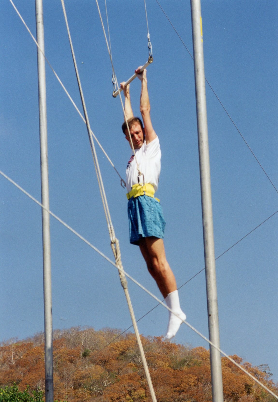 Tonight’s story, which I don’t think I’ve told before, is the story of Andy and the flying trapeze. As I have discussed before, 1998 was a very problematic year. Steve and I had taken, at that point, to taking one week vacations with Atlantis Events to Mexican beach resorts (this is before they were in the cruise business) to be with our gay tribe and to recharge our batteries. The resort at Blue Bay Manzanillo was especially helpful as it was so isolated and so gorgeous. (Hint hint Rich Campbell…) The winter of 97-98 was so bad work wise that we booked not one, but two weeks back to back in April/May of 1998. Three days before we left, UC Davis let me know that the system had defunded everything I had been working on in Geriatrics for the last decade and I would be out of a job in a couple months. Needless to say, I was reeling when we got to Mexico and not in a good space. One of the activities that year was flying trapeze lessons and Mary Kelly was one of the professional acrobats brought in to make sure guests did not break their necks. I took one look at the rig, felt scared by it, but at the same time resolved that the only way I was going to get in the right frame of mind to deal with my life challenges was to work up some courage so I signed up. The first time I stood at the edge of that little platform to swing, I was incredibly nervous, but I made the jump and immediately felt liberated. I kept working at it those two weeks, didn’t become good as I’m not naturally athletic but improved. When I got back to California, as things went from bad to worse in the job department, I kept telling myself ‘you can jump off a 30 foot platform, you can handle this’.