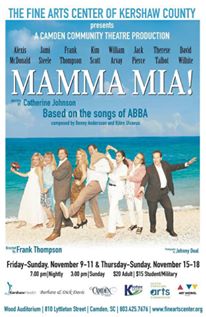 The purpose of this trip is a visit to old friend Frank Thompson and his lovely wife Laurel Posey. He’s been busy with a production of Mamma Mia! that he directed and in which he plays Sam (the Pierce Brosnan part). About an hour outside of Columbia, I get a text from him that the actor playing Bill (the Stellan Skarsgard role) has been unwell and, in looking at all his options, he wondered if I might be able to step in, book in hand. I have visions of the actors nightmare come to life but fortunately, William Arvay was well enough to perform so I could relax a bit. Chatted for a bit and then Frank, Ripley Thames, and I headed for Camden SC and the Kennesaw County Fine Arts Center.