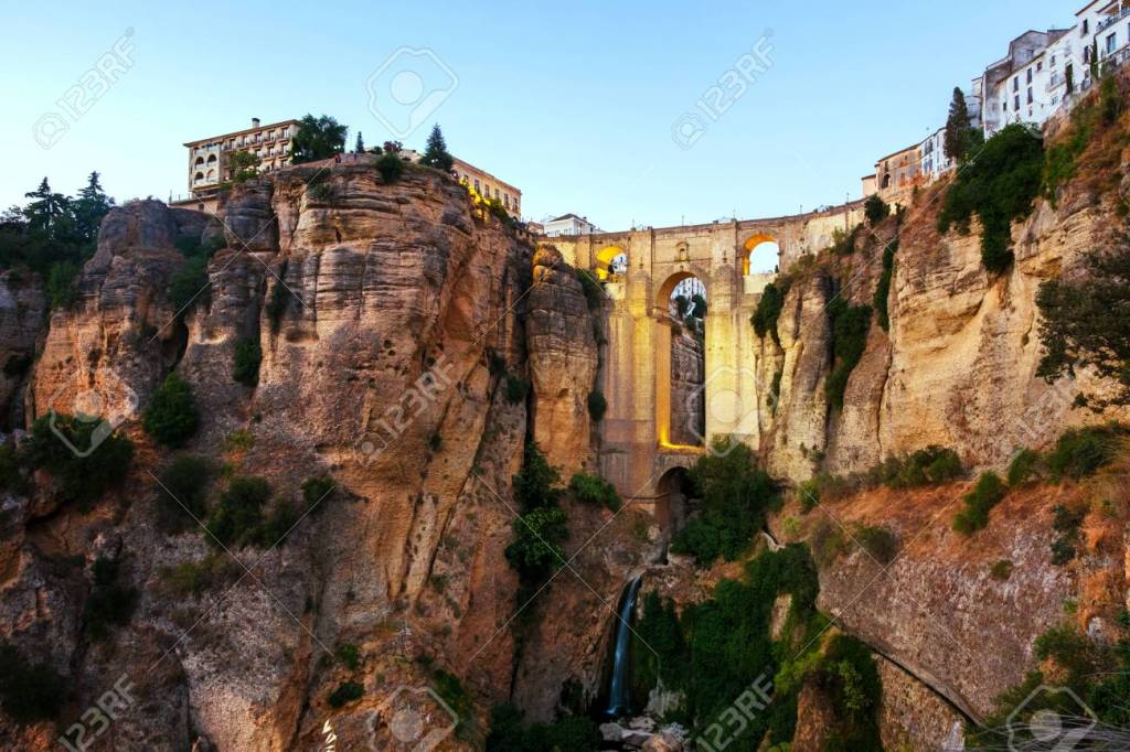 I had breakfast as the sun rose over the Mediterranean, promising another lovely day on the Costa del Sol. However, I and my traveling companions had a schedule to keep so it was back on the bus. We left the environs of Marbella and soon found ourselves climbing a winding mountain road over the original Sierra Nevada Mountain Range which backs up on the Spanish coast line. At first, we were winding through neighborhoods of opulent villas, reminiscent of Malibu or Bel Air. The occasional Lamborghini or Maserati cruising by completed the picture. Eventually, we were far enough a way from the sea that the cars turned into Renaults and Peugeots and we passed over the crest at about 3000 feet in one of Spain’s National Parks – forests and the occasional white washed village. We then descended into an agricultural plain, mainly ranching rather than crops and were soon in the town of Ronda. a small fortified town on top of a bluff riven by a small canyon formed by the Guadalevin river.