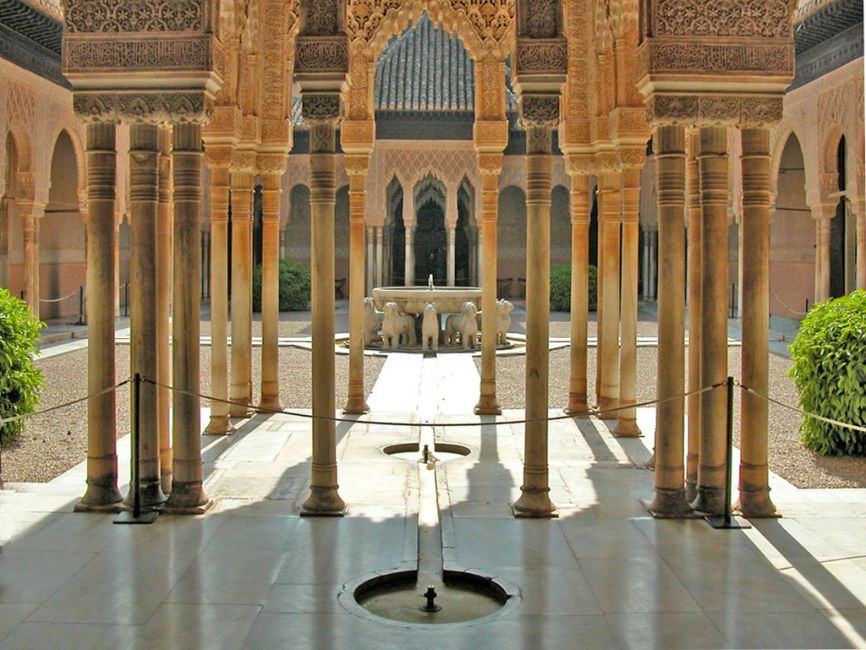 Granada, as it’s in a mountain valley near the Sierra Nevada range, was deliciously cool this morning as the mountain winds descended overnight. I actually needed a pullover for the first time this trip. It rapidly warmed up and was in the 80s by noon, but without the humidity of the coastal areas. Our guide met us this morning and we headed off to the Alhambra. One of the nice things about Tauck Tours is they arrange everything in advance so there is no waiting in line. The Alhambra is one of the most visited sites in Europe and access is strictly limited to keep the flow of visitors down to protect 13th and 14th century buildings and interiors. Tickets often have to be reserved months in advance. However, through whatever magic, we were able to walk right in through the magnificent gate of justice and spent the next two and a half hours in the halls, courts and gardens of the sultans of Granada, the last of the Muslim kingdoms on the Iberian peninsula, lasting from the mid 1200s after the fall of Seville to the Christians through a negotiated settlement and withdrawal to Ferdinand and Isabella in 1492. The fortified palace the Sultans built for themselves on the crest of the hill with its intricate Islamic decorations, beautifully hydraulically engineered fountains (still using the original plumbing system), and acres of courtyard and terraced gardens was never attacked in war. Napoleon, on leaving the city late in the Peninsular wars ordered that it be blown up to deprive the Spanish of a stronghold, but the French were only able to damage the east end of the complex due to some enterprising Spanish soldiers who cut the fuses to the munitions placed in the west end.