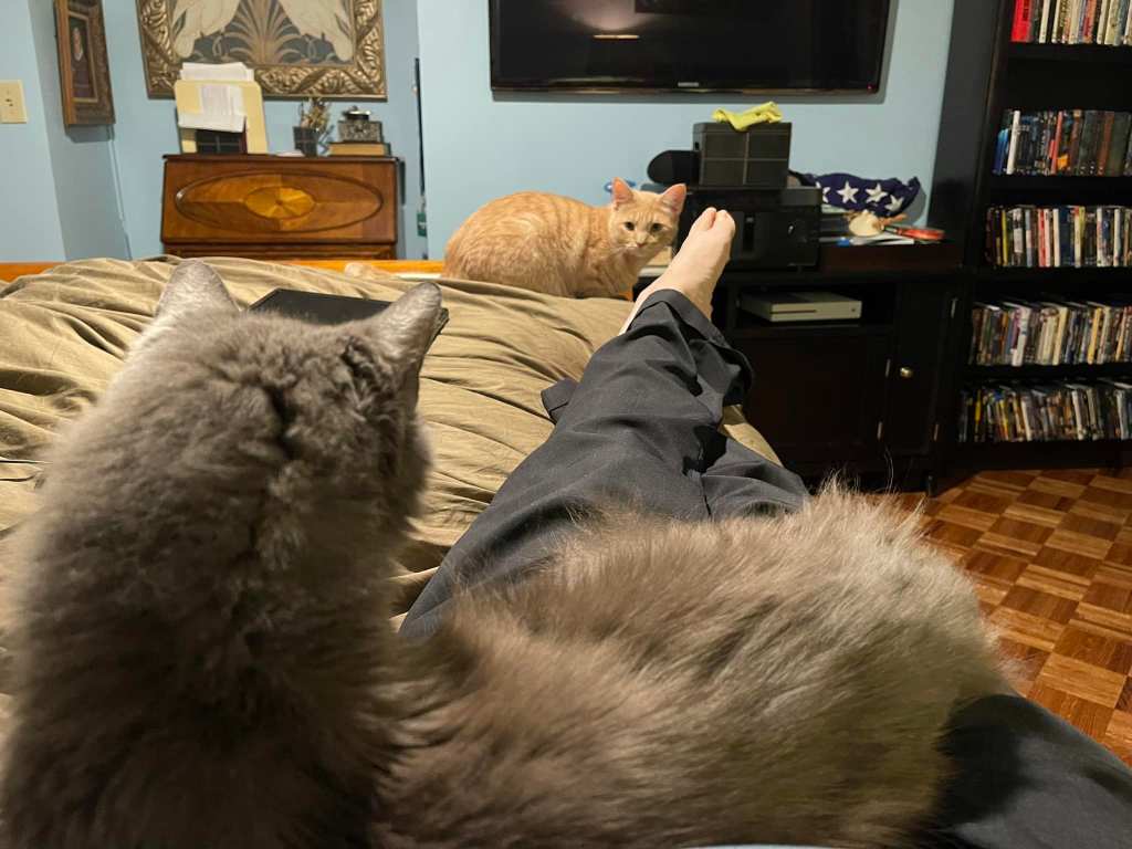 And another long Thanksgiving weekend draws to a close. I’m lying here in bed losing a battle against napping. Perhaps it’s Oliver tucked up against me snoring away. Binx, the ghost cat, will sometimes get up on the bed with us as well but he still won’t come near me and if I make any motion in his direction, he immediately hightails it under the bed for the next quarter of an hour. It’s an improvement over hiding in the fireplace or under the shelves in the guest closet all day I suppose. Someday he may figure out I mean him no harm and am the source of all kitty treats. In the meantime, cat behavior is simply what it is.