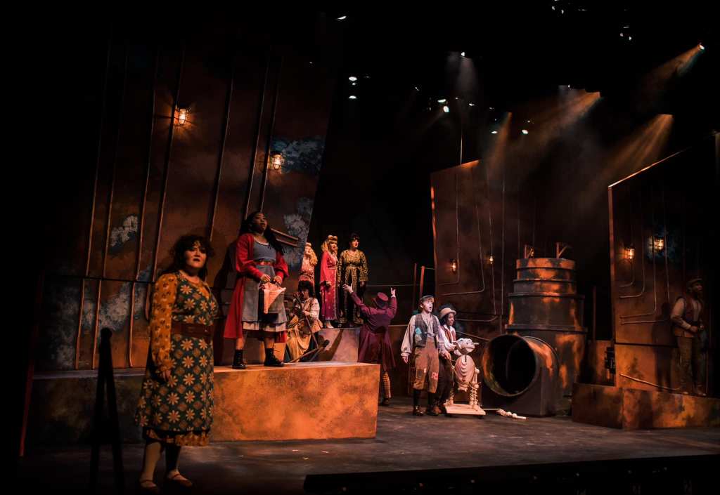 This production made some interesting, but unified design choices, throwing out Disneyana for a steampunk aesthetic. The set was inspired by the late 19th century cast iron and rivet behemoths of Sloss Furnaces, familiar to all residents of Birmingham and environs and perfectly in keeping with the Jules Verne look of the costumes. While there were some individual choices in terms of look that I wasn’t especially fond of, the whole production under the direction of Valerie Accetta reached out and grabbed the audience and held their attention for nearly three hours. I’m often a bit non-plussed at college productions as young performers have such a difficult time portraying maturity and middle-age but I had no such qualms this time.