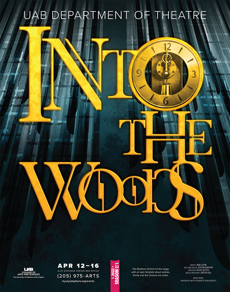 I returned to the Alys Stephens Center (site of the Jemison Symphony Concert Hall) again today to attend UAB Theater’s production of Into The Woods. The Alys Stephens Center has multiple performance spaces and the Theater Department uses the Sirote (proscenium) and the Odess (black box) spaces for their productions throughout the school year. It was a last minute decision. I wasn’t going to go as I have a bunch of other things I needed to get done but the siren call of Sondheim proved to be irresistible so I ran down the hill half an hour before curtain for a last minute ticket. (And I implicitly trust any musical that has Carolyn Violi as musical director – she is a genius). I have a soft spot for this show in particular as it was the first Broadway musical I actually saw on Broadway on my first trip to New York (original cast – second week of the run). I ended up seeing it a number of times (thank you Billy Livsey) including a couple of second acting episodes when such things were still possible. That original cast had one of the best and most affecting performances I’ve ever seen on stage, Joanna Gleason as The Baker’s Wife. I still hold it up as a yardstick by which I measure others on stage.