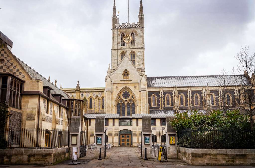 Southwark cathedral has a long and varied history which I will not repeat in its entirety but its origins as a religious site go back as early as the 7th century and the original priory appears to have been under the control of William the Conqueror’s half brother Odo after the Norman Conquest. The current church was constructed in the 13th century sometime after the original was destroyed in the great fire of 1212. It was improved and enlarged in the centuries that followed but was falling into ruin by the early 1800s when there was a major restoration. It was damaged by bombs in the Blitz but not destroyed. There are shrapnel scars still visible on the exterior walls. Shakespeare’s brother is buried there and parishoners have included everyone from Geoffrey Chaucer to Charles Dickens over the years. It’s most famous current resident is Hodge, the cathedral cat, who made appearances both at rehearsal and the performance but wisely refrained from entering the stage area.