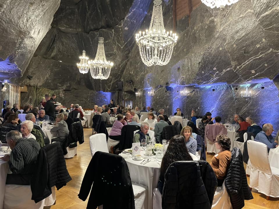 This afternoon was a new experience, a tour followed by a four course formal dinner 400 feet underground in a decommissioned salt mine. They were actually mining salt here form Neolithic times until they ceased mining operations in the 1990s when they figured out they could make a great deal more money by opening to tourists and have them travel through hundreds of years of mining history and technology carved into the salt deposit. (A prehistoric inland sea that dried up leaving a salt pan that was converted to rock salt over millennia of geologic processes). Many galleries, chambers and steps carved from rock salt, most of what we saw dating from the 17th century but we covered very little of the total despite two hours and several miles of walking. The dinner, in a formal dining room carved out of rock salt with chandeliers decorated with salt crystals was very good.