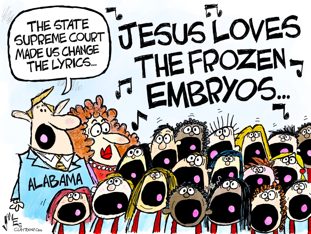Usually my jaw drops at the political news out of Texas and Florida which seem to be trying to race each other to see which can be crueler more completely to their marginalized populations. Alabama, of course, leap frogged over both of them with its rather unbelievable ruling that a frozen embryo was indeed a person. I can’t completely blame the Alabama Supreme Court on this one (although Tom Parker, the chief justice is a seven mountains dominionist). The legislature created and the population passed an Alabama constitutional amendment that clearly stares that unborn potential lives such as embryos are humans for purposes of law and the court decision merely pointed out what was already clear in the not very well thought out amendment that was pushed through by prolife forces. Just one more example of why politicians should not be practicing medicine. The Alabama legislature, with egg on its face, as well as in the petri dish, is desperately trying to back pedal on this one as it has caused serious issues for their rich white campaign funders as it basically prevents IVF and other advanced fertility treatments from happening as any mistreatment of an embryo could be construed as child abuse, or if the embryo is rendered non-viable manslaughter or murder. Perhaps the legislature will be a bit more hesitant to pass poorly worded laws about very complicated subjects in the future. Naaaah…