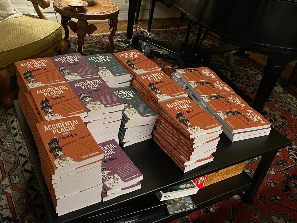I checked my sales figures. The Accidental Plague Diaries continues to sell a few copies here and there. I’m thinking there might be a decent market in another couple of years when the children of the pandemic – those who were in elementary school at the time and too young to fully comprehend what was happening age into middle and high school and might want some sort of relatively readable chronicle of what the heck happened and why. I have a couple of readings and signings coming up the next couple of months and I need to get off my butt and really start working on the new book. I just haven’t had the energy. And I’ll have to do it around my performance commitments for the rest of the season (a symphony concert, a play, an opera concert, a musical, and directing a Shakespeare between now and Labor Day).