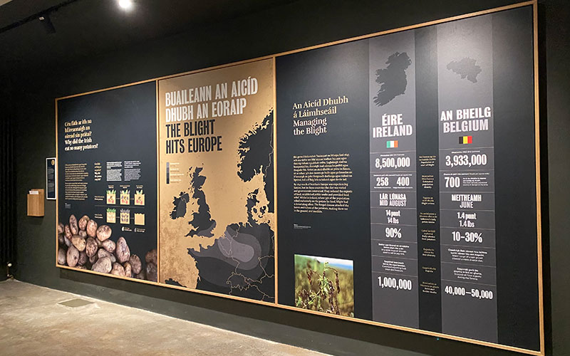 The first leg was from Dublin to a town called Strokestown in the middle of the country. We stopped there to visit Strokestown house, one of the grand old Georgian country manses that survive and to take in the National Famine Museum that it houses. One may ask why the museum commemorating the potato blight and famine of the 1840s is in such an out of the way place and not in Dublin, the answer lies, as it often does, in historical accident. Strokestown house was occupied by one family, the Mahons, for about 300 years as the lands and rents were granted to the family by Oliver Cromwell in his English colonization enterprises of the 1680s and the last member of the family not having vacated until about 1980. The Mahons must have been packrats as the man who bought the estate in the late 70s, intending to raze it, started to rooting around in disused cupboards and found more or less a complete archive and history of the family, the tenants and the workings of the plantation including full documentation of what happened to the 12,000 or so people who lived on the land at the time of the famine. The head of the family at that time, Dennis Mahon, was a piece of work. Profligate and with no interest in the humans who depended on him and the estate to survive, solely in the profits he felt were his due, he was eventually assassinated by the locals, but not before thousands of his tennants died or emigrated (after walking to Dublin), aided by the Mahons as they figured out that paying passage for their dying tennants in coffin ships headed to Canada was cheaper than paying the relief taxes imposed by the need for workhouses and soup kitchens.