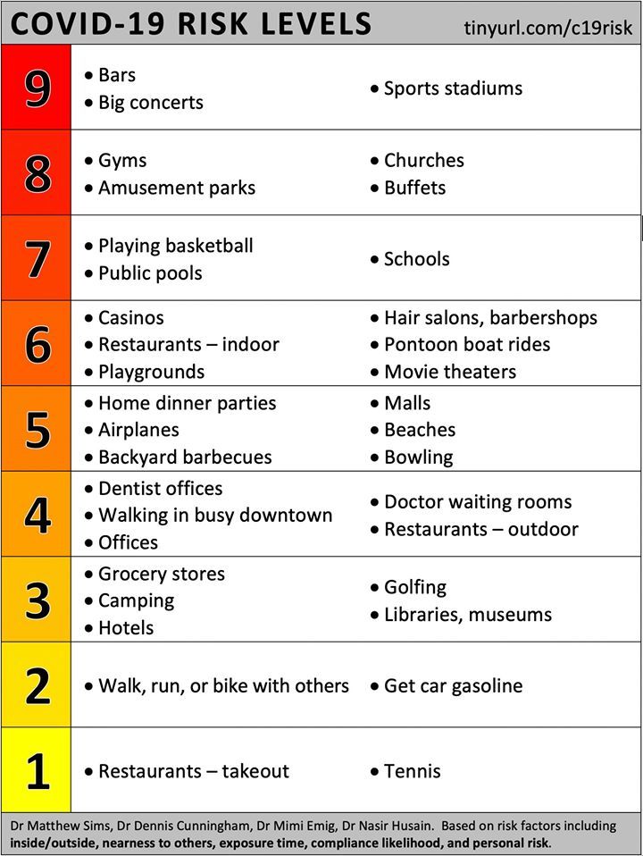 Back to Covid 19. A friend of mine brought up a situation in her family where a cousin and his family had made the decision to go visit his elderly mother and traveled out of state to spend a week with her so she could have some grandchildren time and wanted to know what I thought of that decision. My response was that life is risk and that you always have to compare risk for reward. As mom lived alone, and not in a group setting where others could be endangered, if she thought the reward of family time was greater than the risk of possible contagion, it was her decision to make. Ditto the decision on the part of the cousin and his family. Every individual, family system, set of circumstances, beliefs, et al. are different for each such decision, and trying to impose arbitrary judgments usually fails. So what should we do as responsible individuals as things start to open up? I think we need to learn better risk stratification.
