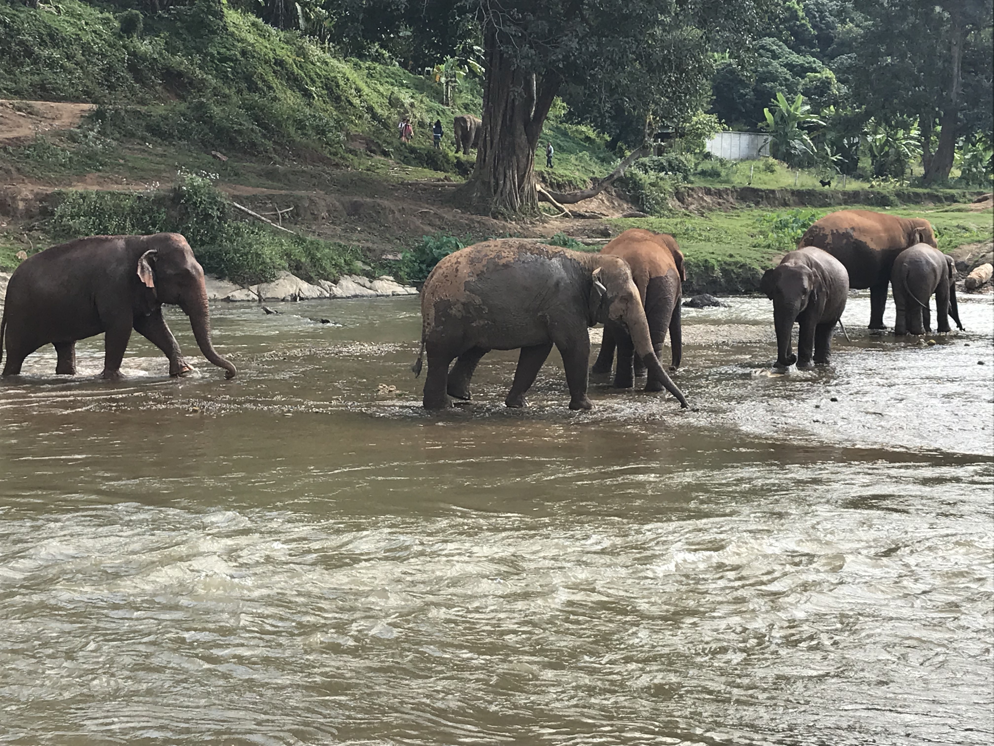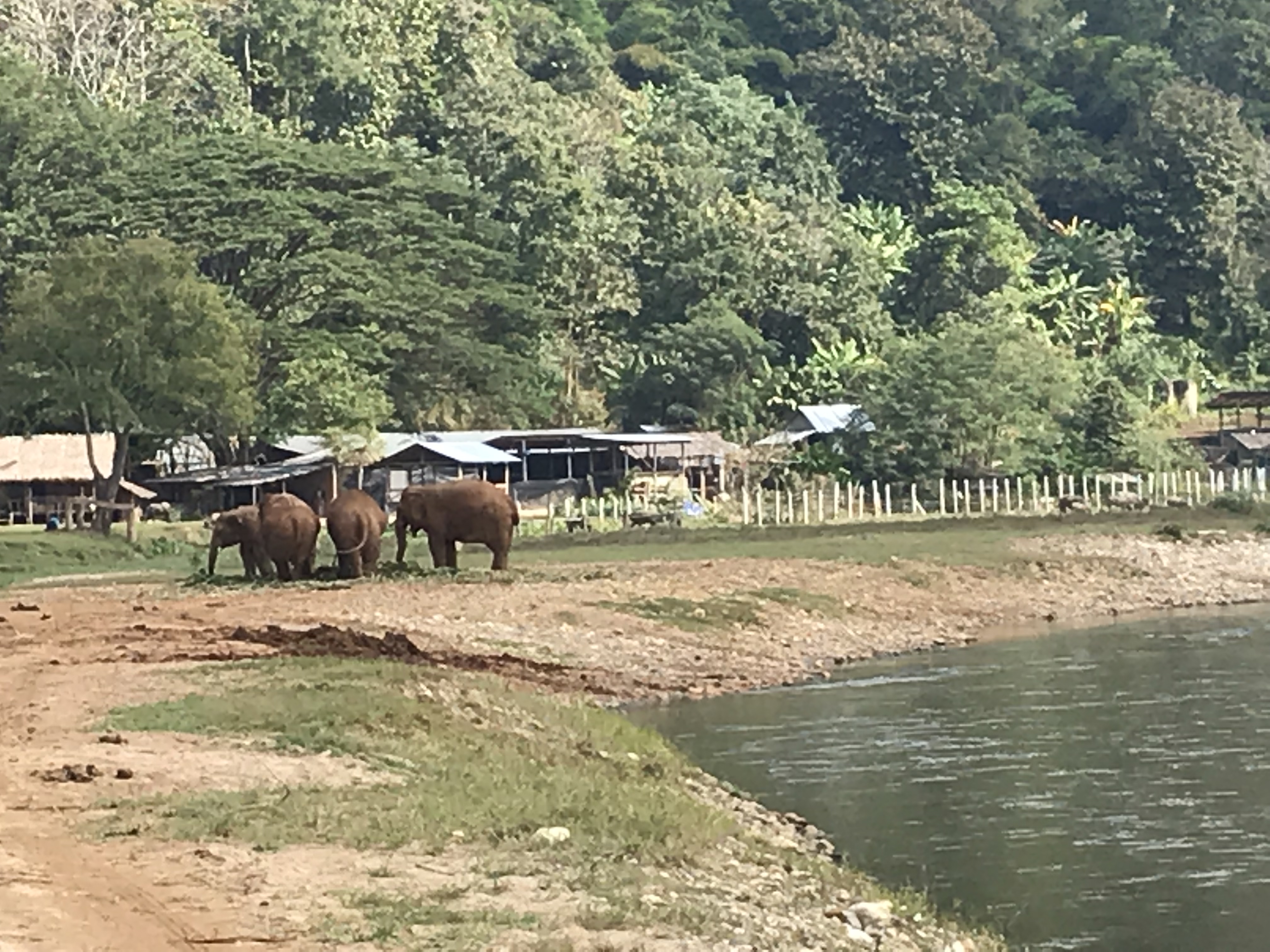 We arrived at the Elephant Nature Park (https://www.elephantnaturepark.org/) in one piece, molars only slightly loosened. Feeding time and bunches of bananas quickly disappeared into inquisitive trunks. Then a walk through the grounds to meet the elephants, the water buffalo and a couple of zillion dogs and cats (they rescue those as well. I declined to adopt one on my way out the door.). After lunch, over to the river to watch them gambol about at bathtime. In the usual tropical temperatures of northern Thailand, it would have been a sticky and uncomfortable day but I lucked out with the weather and it was in the 70s, cool with high overcast and a light breeze making it all a very pleasant experience.